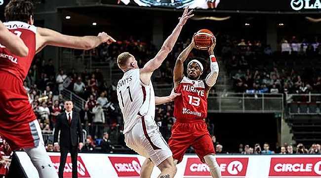 Karşılaşmaya Ali Muhammed'in 3 sayılık basketleriyle etkili başlayan A Milli Takım, Furkan Aldemir ve Kenan Sipahi'nin pota altında kazandırdığı sayılarla 3. dakikada 10-4 öne geçti. Pota altında Pasencniks'in bulduğu sayılarla 5. dakikada 10-10 eşitliği yakalayan Letonya karşısında Ali Muhammed, Melih Mahmutoğlu ve Doğuş Balbay'la dış atışlardan skor üreten milliler, ilk periyodu 21-14 üstün geçti.İKİNCİ PERİYOT
