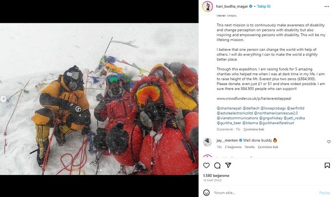 Çeşitli nedenlerle ertelenen birkaç girişimin ardından Hari Budha Magar ve Krish Thapa önderliğinde bir grup Nepalli dağcı, 2023 yılında en az 10 kişinin öldüğü Everest'e tırmanmayı başardı. İngiltere'nin Canterbury kentinde yaşayan Budha Magar, 10 yaşındaki oğlunun tırmanışa kalkışması konusunda özellikle endişelendiğini söylerken "Kendime söz verdim, 'Senin için geri geleceğim. Orada ölüp gitmeyeceğim" dediğini belirtti. Washington Post'a konuşan 43 yaşındaki Magar, "Bazen anlattıklarım gerçek gibi gelmiyor" derken, tarihi olay için titiz planlar yaparken yıllar süren bir eğitim rejimine başladığını belirtiyor. Budha Magar "Engelli insanların mutlu, başarılı ve anlamlı bir yaşam sürebileceklerini göstermek istedim" derken başka pek çok şeyin de başarılabileceğinin altını çizdi.