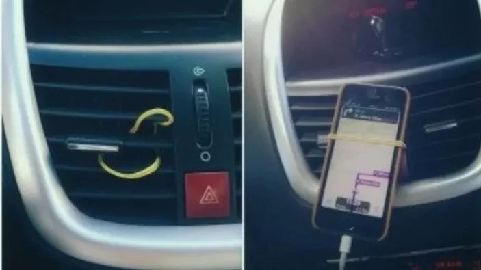 Araç kullanırken navigasyona bakmanız ya da telefonlara cevap vermeniz gerektiğinde telefon tutucular hayatınızı kolaylaştıracaktır. Fakat bir telefon tutucunuz yoksa yalnızca lastik kullanarak kendi tutucunuzu yapabilirsiniz. Lastiği, telefonunuzun üst ve alt kısımlarından geçirin, ardından sabitlemek için havalandırma deliklerinden geçirin.