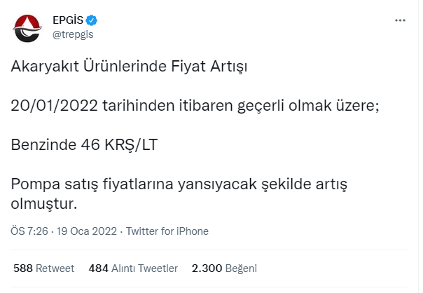Enerji Petrol Gaz İkmal İstasyonları İşveren Sendikası (EPGİS), bu gece yarısından itibaren benzinin litre fiyatına 46 kuruş zam yapıldığını açıkladı. Bu zamla birlikte benzinin litre fiyatı da 14 TL’yi geçecek. Benzine yapılan ve bu geceden itibaren uygulanacak zam, EPGİS tarafından duyuruldu. EPGİS açıklamasında, "Akaryakıt Ürünlerinde Fiyat Artışı 20/01/2022 tarihinden itibaren geçerli olmak üzere; Benzinde 46 KRŞ/LT Pompa satış fiyatlarına yansıyacak şekilde artış olmuştur" denildi. Motorinin litre fiyatına dün gece 42 kuruş zam yapılmış ve litre fiyatı 14,34 TL’ye ulaşmıştı. Bu geceki zamla birlikte benzinin litre fiyatı da 14 lirayı aşacak ve 14,12 TL’ye ulaşacak.