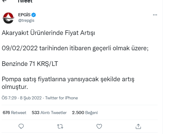 Enerji Petrol Gaz İkmal İstasyonları İşveren Sendikasından (EPGİS) alınan bilgiye göre, benzinin litre fiyatında 71 kuruş zam yapıldı. Böylece benzinin litre fiyatı, son bir ayda gelen zamlarla toplamda 2,80 TL artmış oldu. Zamlarla birlikte benzinin litre fiyatı İstanbul’da 15,18 TL’ye, Ankara’da 15,28 TL’ye, İzmir’de 15,30 TL’ye yükselecek. Akaryakıt fiyatları, Türkiye'nin de dahil olduğu Akdeniz piyasasındaki işlenmiş ürün fiyatlarının ortalaması ile dolar kurundaki değişiklikler baz alınarak rafineriler tarafından hesaplanıyor. Bu hesaplama sonucunda dağıtım firmalarınca uygulanan fiyatlar, rekabet ve serbesti nedeniyle şirketler ve kentlere göre küçük değişiklikler gösterebiliyor.