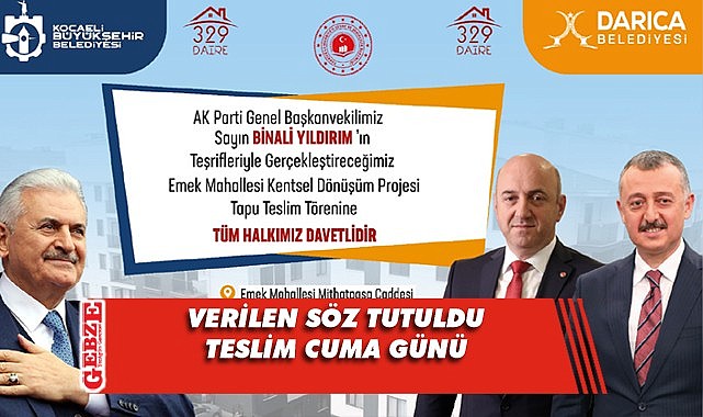 Oldukça titiz ve hızlı bir çalışmanın yürütüldüğü proje tamamlanırken hak sahiplerine tapuları düzenlenecek teslim töreni ile dağıtılacak. AK Parti Genel Başkanvekili ve Türk Devletleri Teşkilatı Aksakallılar Heyeti Başkanı Binali Yıldırım’ın katılımıyla gerçekleşecek tapu teslim töreninde hak sahipleri tapularına kavuşacak. 27 Mayıs Cuma günü saat 10.00’da kentsel dönüşümün gerçekleştiği alanda (Mithatpaşa Caddesi) düzenlenecek tapu dağıtım törenine Son Başbakan Binali Yıldırım’ın yanı sıra Kocaeli Büyükşehir Belediye Başkanı Tahir Büyükakın ve Darıca Belediye Başkanı Muzaffer Bıyık ile birlikte AK Parti Kocaeli milletvekilleri ve bölge protokolü katılacak. Vatandaşların da yer alacağı törende hak sahiplerine tapuları teslim edilecek.