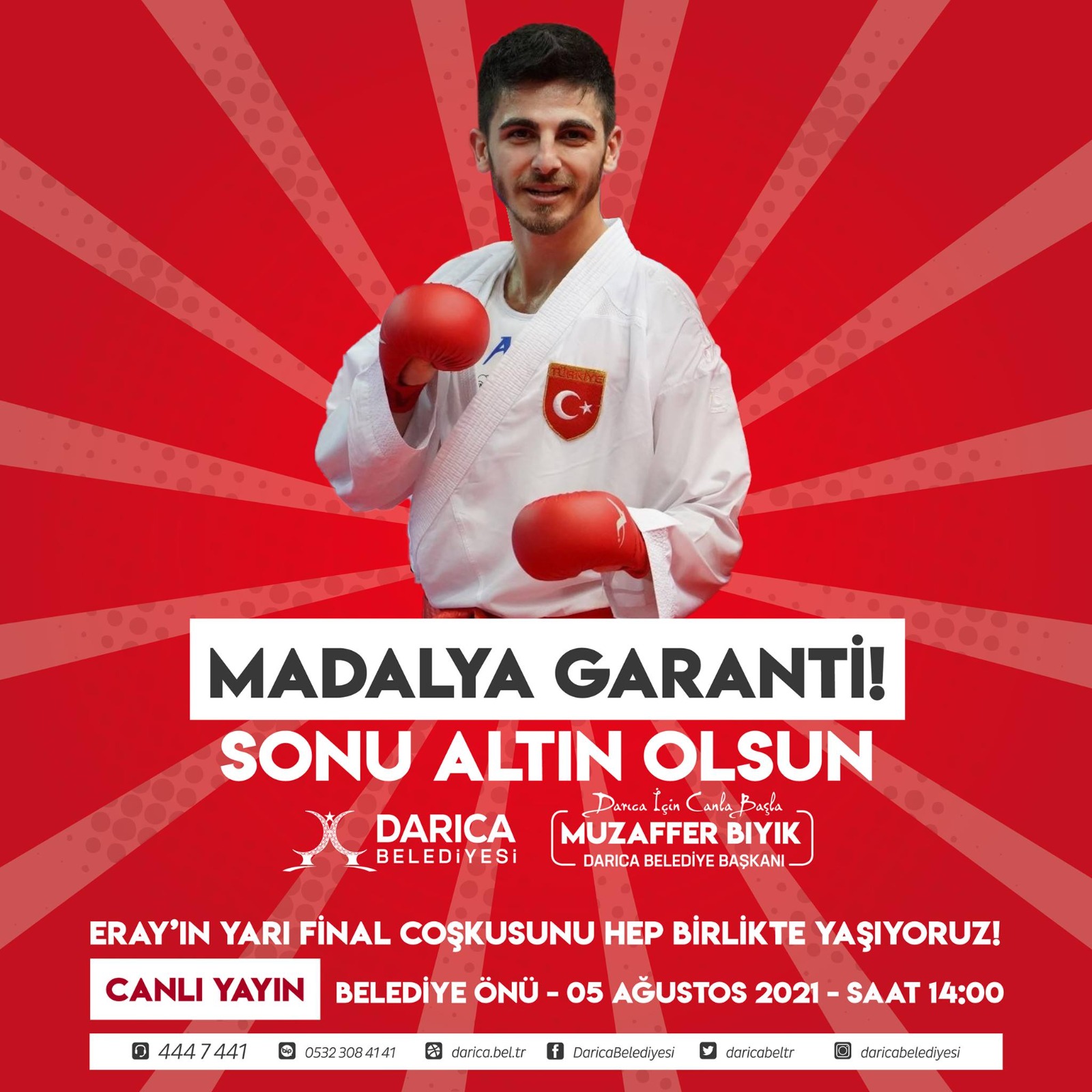 Gebze bölgesinin gururu, Darıca Belediyesi Eğitim ve Spor Kulübü’nün milli sporcusu Eray Şamdan, Tokyo 2020 Olimpiyatları’nda karate branşında yaptığı grup maçlarında 3 galibiyet, 1 mağlubiyet alarak grubunu ikinci sırada tamamlamış ve yarı finale çıkarak madalya almayı garantilemişti. Eray’ın bu başarısının coşkusunu yaşayan Darıca Belediye Başkanı Muzaffer Bıyık, Darıcalılara Eray Şamdan’ın yarı final maçını dev ekranda izlemek için davette bulundu. Konu hakkında açıklamalarda bulunan Bıyık, şunları dile getirdi; “Madalya garanti, sonu altın olsun! Darıca Belediyesi Eğitim ve Spor Kulübümüzün milli sporcusu Eray Şamdan Tokyo 2020 Olimpiyatları’nda yarı finale kalarak madalyayı garantiledi. Biz de Eray'ın coşkusunu paylaşmak için Belediye binamızın önündeki dev ekrandan mücadeleyi yayınlıyoruz. Tüm halkımız davetlidir.”