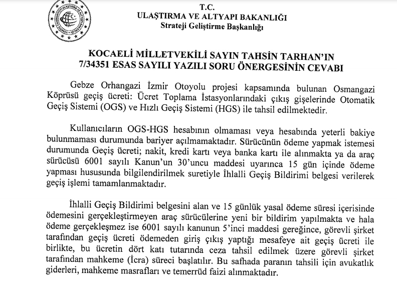 Sözlerine devam eden Tarhan, “Ceza tebligatının vatandaşa ne zaman gönderildiğine dair sorumuza Bakanlık, 6001 sayılı kanunun 5’inci maddesini işaret etmiştir. Ancak kanunun bu maddesi incelendiğinde yürürlükten kaldırıldığı görülecektir. Kanunun geçici 5. maddesi ise Osmangazi Köprüsü’nü kapsamayan bir maddedir. Sorduğumuz bu önemli soruya Bakanlık’ın bu tavrını özensiz buluyorum. Biz burada vatandaşın derdine derman olmaya çalışırken Bakanlık hem yüksek cezalara göz yummakta, hem de sorulan sorular için doğru bilgi vermeye dahi tenezzül etmemektedir” diyerek sitemini dile getirdi."4 KAT İLE CEZALANDIRMAK ADALETSİZLİKTİR"