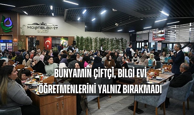 24 Kasım Öğretmenler Günü kapsamında gün boyu eğitimcilerle bir araya gelen Çayırova Belediye Başkanı Bünyamin Çiftçi, günün son etkinliğinde Çayırova Belediyesi Bilgi Evleri’nde görev yapan öğretmenlerle buluştu. Çayırova Belediyesi Sosyal Tesisleri’nde gerçekleşen programa Başkan Çiftçi ve bilgi evi eğitimcileri katılım sağladı. Bilgi Evi öğretmenlerinin 24 Kasım Öğretmenler Günü’nü tebrik ederek, öğretmenlik mesleğinin ne kadar özel olduğuna vurgu yapan Başkan Çiftçi, programdaki konuşmasında şunları dile getirdi; “Bugün 24 Kasım Öğretmenler Günü. Öğretmenlik çok kutsal bir meslek. 9 mahallemizde 8 bilgi evimizde hizmet veriyoruz ve bilgi evlerimizde çocuklarımızı 5 yaşında alıyor, üniversiteyi kazanana kadar eğitim hayatlarına katkı sunuyoruz.