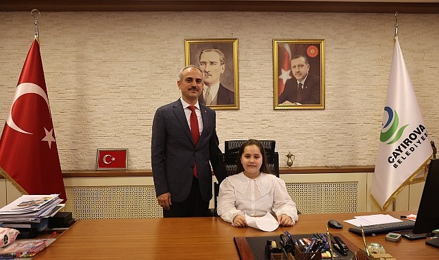 23 Nisan Ulusal Egemenlik ve Çocuk Bayramı etkinlikleri kapsamında, Çayırova Belediye Başkanı Bünyamin Çiftçi, koltuğunu Hira Aydın’a teslim etti. Çayırova Belediyesi Başkanlık makamında gerçekleştirilen programa Başkan Çiftçi’nin yanı sıra, Mehmet Akif İlkokulu Müdürü Emrullah Yıldız, Mehmet Akif İlkokulu Sınıf Öğretmeni Abdülkadir Taştan, 4. Sınıf Öğrencisi Hira Aydın ve ailesi katılım sağladı. Başkan Çiftçi, Hira Aydın ve çocukların 23 Nisan Ulusal Egemenlik ve Çocuk Bayramı’nı tebrik ederken, daha sonrasında koltuğunu minik başkana devretti. Başkanlık Makamına oturan Aydın ise şunları dile getirdi, “Öncelikle koltuğunu bana devreden sayın belediye başkanımız Bünyamin Çiftçi’ye teşekkür ederim. Bugün burada 23 Nisan Ulusal Egemenlik ve Çocuk Bayramı’nı kutlamak için, bir araya geldik. Bu anlamlı günü biz çocuklara armağan eden Büyük Lider Gazi Mustafa Kemal Atatürk’e saygı ve minnetlerimi sunuyorum. Bugün belediye başkanlığı koltuğuna oturmak benim için büyük bir heyecan değil, aynı zamanda büyük bir sorumluluktur. Çünkü biz çocuklar geleceğin yöneticileri, öğretmenleri, doktorları ve liderleriyiz. Bu koltukta otururken kendi adıma değil, tüm çocuklar adına konuşuyorum. Biz çocuklar daha fazla oyun alanı, daha temiz bir çevre ve daha mutlu bir gelecek istiyoruz” dedi. Çiftçi ise, minik başkanın konuşmasının ardından, Çayırova’ye 250 bin metrekare yeşil alan kazandırdıklarını belirtirken, minik başkanın talimatları doğrultusunda daha fazla yeşil alan üretmek için gayre edeceklerini dile getirdi. Program günün anısına çekilen hatıra fotoğrafıyla sona erdi.