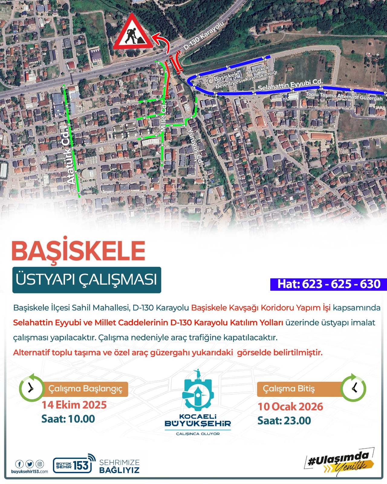 Kocaeli Büyükşehir Belediyesi, D-130 Karayolu üzerinde yapımı süren “Başiskele Kavşağı Koridoru Projesi” kapsamında önemli bir trafik düzenlemesi yapıyor. Proje çalışmaları çerçevesinde, Selahattin Eyyubi Caddesi ve Millet Caddesi’nin D-130 Karayolu’na bağlantı yolları üzerinde imalat çalışmaları başlatılacak. Bu nedenle söz konusu bağlantı yolları geçici süreyle araç trafiğine kapatıldı. ALTERNATİF GÜZERGÂHLAR