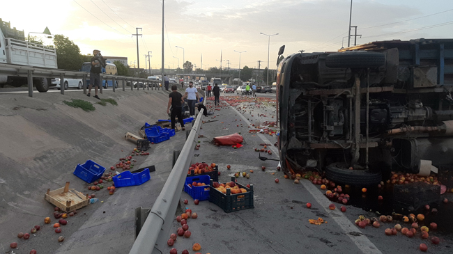 Devrilen kamyonda bulunan meyve ve sebzeler ise kara yoluna saçıldı.