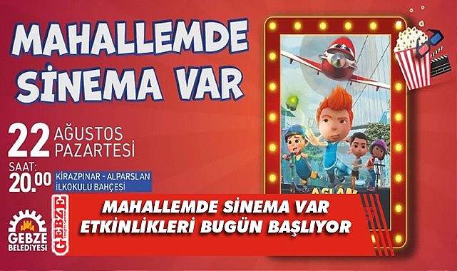 Gebze Belediyesi Mahallemde Sinema Var etkinlikleri programı ise şöyle: “22 Ağustos Pazartesi Kirazpınar Alpaslan İlkokulu Bahçesi Aslan Hürkuş Kayıp Elmas, 23 Ağustos Salı Mutlukent Mustafa Üstündağ Ortaokulu Bahçesi Bir Türk Masalı Öksüz Kız, 24 Ağustos Çarşamba Beylikbağı İl Genel Meclisi Ortaokulu Bahçesi Doru Filmi, 25 Ağustos Perşembe İnönü Fevzi Çakmak İlkokulu Bahçesi Luca Filmi, 26 Ağustos Cuma İstasyon Ahmet Zeki Büyükkuşoğlu Ortaokulu Bahçesi Aslan Hürkuş Kayıp Elmas, 27 Ağustos cumartesi Tatlıkuyu Mollafenari Anadolu İmam Hatip Lisesi Bahçesi Öksüz Kız Filmi, 28 Ağustos Pazar Arapçeşme Bilim Sanat Merkezi Bahçesi Doru Filmi, 29 Ağustos Pazartesi Mimar Sinan Mimar Sinan Ortaokulu Bahçesi Luca Filmi.” Gebze Belediye Başkanı Zinnur Büyükgöz Gebzeli çocukları ve ailelerini, ücretsiz ‘Mahallemde Sinema Var’ Sinema akşamlarına katılmaya davet etti.