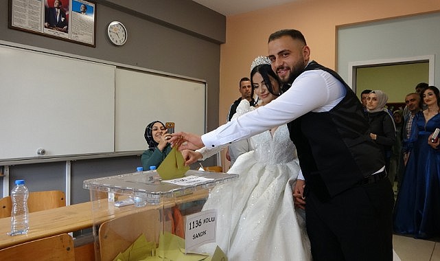 Derince'de bugün düğünü olan Tuğba ve Kadir Marangoz çifti oy kullandı. Düğün telaşına rağmen çift, oy verme işleminin bitmesine 15 dakika kala Derince Bekir Sıtkı Özer Ortaokulu’nda oylarını kullandı. Genç çift gelinlik ve damatlıkla oy kullanacakları okula gelirken, çifti gören vatandaşlar alkışlayarak karşıladı. Telaştan dolayı anca yetiştiklerini belirten damat Kadir Marangoz, “Düğün telaşındayız. Geldik, oyumuzu kullandık. İnşallah her şey dilediğimiz gibi iyi olur, güzel olur. Anca yetişebildik. Bayağı bir telaştaydık. Vatanımıza, milletimize hayırlısı olsun” diye konuştu. Az bir süre kalmasına rağmen oy vermeye yetiştikleri için mutlu olduklarını söyleyen gelin Tuğba Marangoz ise “Ben de aynı şeyleri düşünüyorum. Telaş içindeyiz ama oyumuzu kullanmaya geldik. Herkes için hayırlısı olsun. İnşallah vatanımız için de en güzelleri olur” dedi.