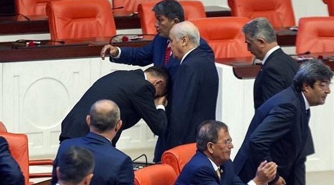 Koray Aydın, Devlet Bahçeli'nin yanına giderek tokalaştı ve bir süre sohbet etti. İkili Meclis'te samimi görüntüler verdi.İYİ PARTİLİ VEKİL BAHÇELİ'NİN ELİNİ ÖPTÜ