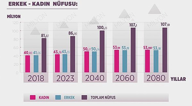 Nüfusta kadın üstünlüğü 40 yıl sürecek, 2080 yılında da kadın nüfusu erkek nüfusundan fazla olacak. Nüfusun 107 milyon 95 bin 998 olması beklenen 2060'ta kadın sayısı 53 milyon 944 bin 560'ı bulacak. Söz konusu yılda erkek nüfusunun ise 53 milyon 151 bin 438'de kalması öngörülüyor.2069'DA NÜFUS 107 MİLYONA DAYANACAK