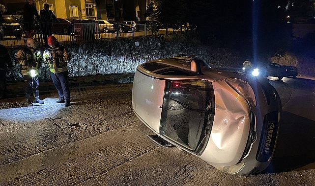 İzmit'te devrilen otomobilin sürücüsü, kazayı yara almadan atlattı.
