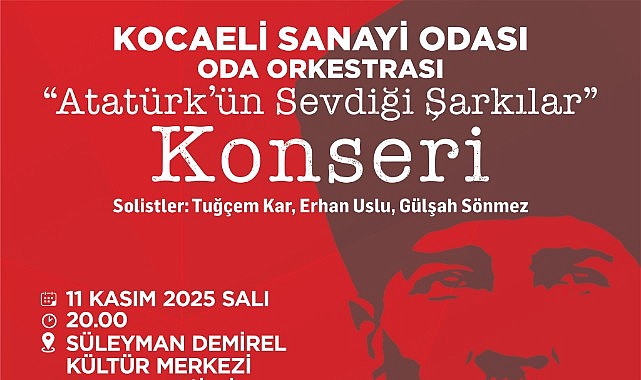 Geleneksel olarak her yıl düzenlenen Kocaeli Sanayi Odası Oda Orkestrası ‘Atatürk’ün Sevdiği Şarkılar Konseri’ bu yıl 11 Kasım Salı akşamı saat 20.00’da düzenlenecek. Kocaeli Sanayi Odası Oda Orkestrası’nın İTÜ Türk Müziği Devlet Konservatuvarı Öğretim Üyeleri; Tuğçem Kar, Erhan Uslu ve Gülşah Sönmez’in icra edecekleri ‘Atatürk’ün Sevdiği Şarkılar Konseri’ İzmit Yahya Kaptan Mahallesi’nde bulunan Süleyman Demirel Kültür Merkezi’nde gerçekleştirilecek. KSO’dan yapılan açıklamada ücretsiz olacak konsere tüm Kocaeli halkı davet edildi.