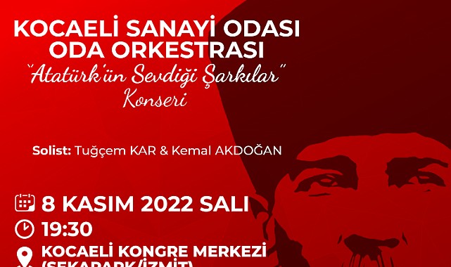 Kocaeli Sanayi Odası (KSO), Cumhuriyetimizin kurucusu Gazi Mustafa Kemal Atatürkün vefatının 84üncü yıl dönümü anısına anlamlı bir etkinliğe imza atıyor. Geleneksel olarak her yıl düzenlenen Kocaeli Sanayi Odası Oda Orkestrası Atatürkün Sevdiği Şarkılar Konseri bu yıl 8 Kasım Salı akşamı, saat 19.30da gerçekleştirilecek. Kocaeli Sanayi Odası Oda Orkestrasının İTÜ Türk Müziği Devlet Konservatuvarı Öğretim Üyeleri Tuğçem Kar ve Kemal Akdoğanın icra edecekleri Atatürkün Sevdiği Şarkılar Konseri İzmit Sekaparkta bulunan Kocaeli Kongre Merkezinde gerçekleştirilecek.