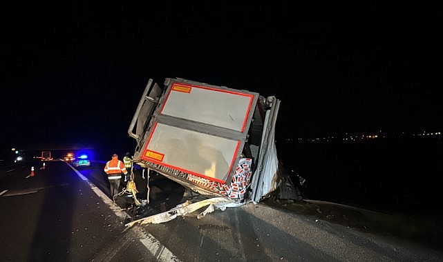 Lastik patlaması sebebi ile sürücüsünün direksiyon hâkimiyetini kaybettiği tır orta refüje çarpmasının ardından yol kenarındaki kanala uçarak devrildi. Kazada sürücü araçtan çıkmasının ardından durumu polis ekiplerine bildirdi. Lastiğinin patladığını ve aracın savrulmaya başladığını belirten sürücü Şaban Toygar, “Kocaeli’den aldığım MDF’leri Bolu’ya götürüyordum. Aracın lastiği patlattı. Orta refüje çarptım. Daha sonra kanala uçtum” dedi. Bölgede karayolları ve bölge trafik ekipleri önlem alırken tır sabah saatlerinde kaldırılacak.
