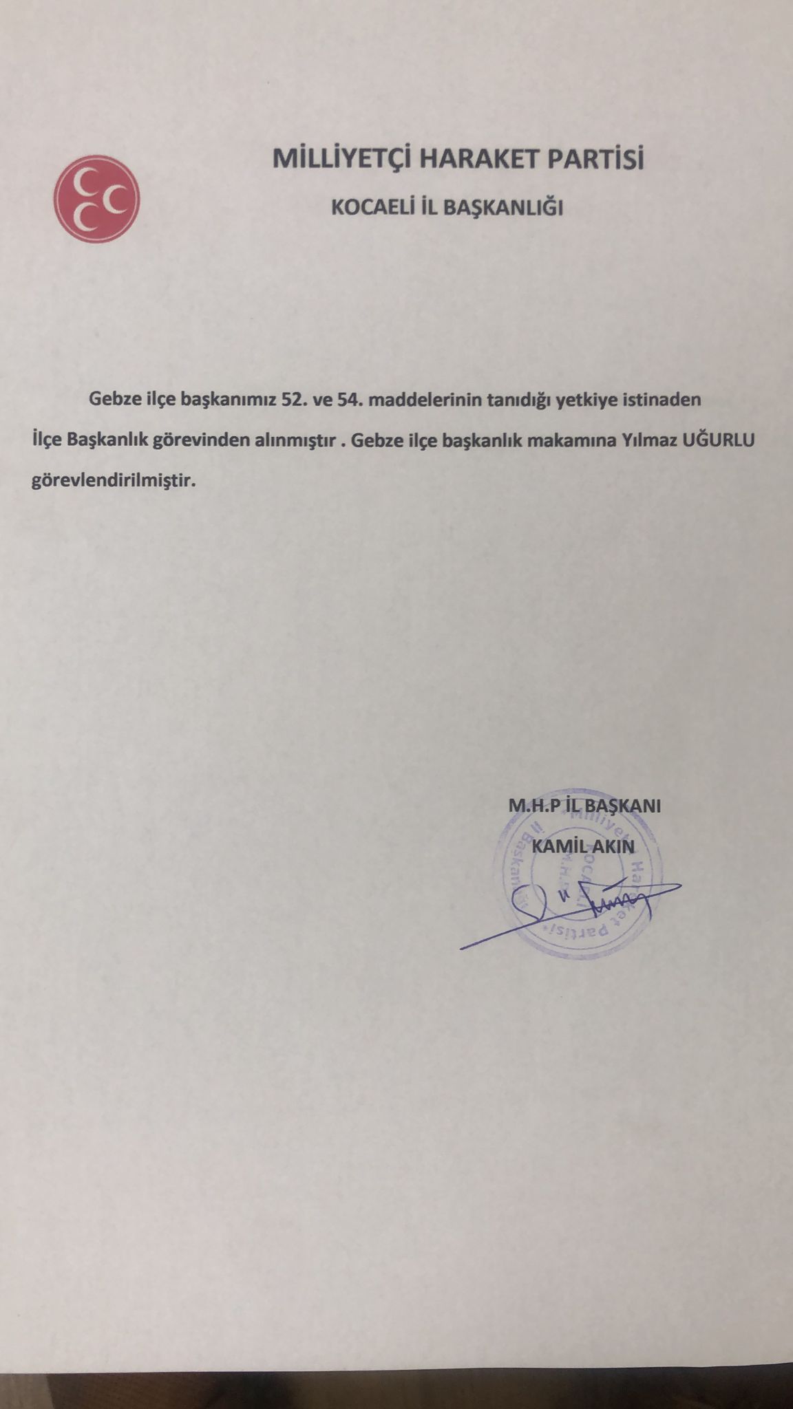 Milliyetçi Hareket Partisi (MHP) Kocaeli İl Başkanlığı tarafından alınan kararla, Coşkun Öztürk’ün yürüttüğü MHP Gebze İlçe Başkanlığı görevine son verildi. Kararın parti tüzüğünün 52 ve 54’üncü maddeleri kapsamında alındığı bildirildi. Öztürk’ten boşalan göreve ise Yılmaz Uğurlu atandı. Atama yazısını, MHP Kocaeli İl Başkanı Kamil Akın tarafından imzalanarak kamuoyuna duyurdu. İl Başkanlığı tarafından yapılan açıklamada, Coşkun Öztürk’e bugüne kadar partiye sunduğu hizmetlerden dolayı teşekkür edilerek, emekleri ve katkıları için minnettarlık ifade edildi. Yeni atanan Yılmaz Uğurlu ile birlikte MHP Gebze İlçe Teşkilatı’nda çalışmaların yeni yönetimle devam edeceği kaydedildi.