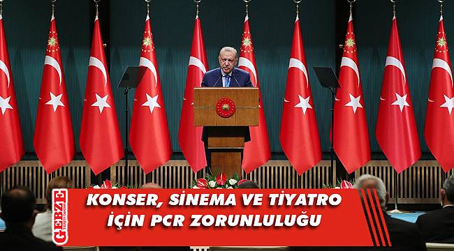 Cumhurbaşkanı Recep Tayyip Erdoğan, Kabine toplantısı sonrası alınan kararları duyurdu. Erdoğan, koronavirüs salgınına yönelik alınan yeni tedbirlerle ilgili PCR testi zorunluluğunun altını çizdi. Buna göre, uçak ve şehirlerarası yolculuk, konser, sinema gibi toplu faaliyetler için zorunlu PCR testi istenecek. PCR testini yaptırmamış olanlar uçak ve şehirlerarası yolculuk, konser, sinema gibi toplu faaliyetlere katılamayacak. Öte yandan Cumhurbaşkanı Recep Tayyip Erdoğan'ın konuyla ilgili açıklamaları şöyle; "Uçak ve şehirlerarası yolculuk, konser, sinema gibi toplu faaliyetler için de zorunlu PCR testi uygulamalarını devreye alacağız."