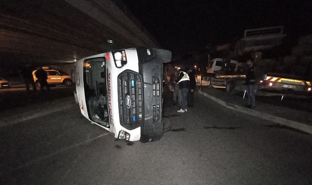 İzmit'te özel halk otobüsü ile çarpışan ambulans yan yattı. Meydana gelen kazada ambulans şoförü ve iki sağlık çalışanı yaralandı.