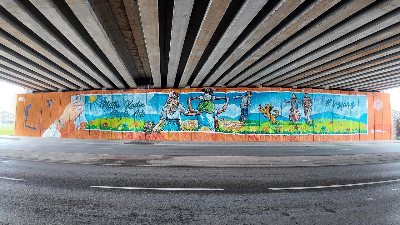 Kadın ve Aile Hizmetleri Dairesi Başkanlığınca yapılan, Aile ve Sosyal Hizmetleri İl Müdürlüğünce destek verilen grafiti çalışmasında turuncu kırmızı ve mavi renkler ağırlıklı olarak kullanıldı. Kullanılan renklerin etkileyici uyumu hem görsel odak oluştururken hem de mesajın daha net algılanmasına katkı sağladı. Grafiti çalışmasında verilen sosyal mesajların toplum tarafından daha kolay fark edilmesi sağlandı. Dayanışmayı, eşitliği ve kadının toplumdaki yerini vurgulayan figürler, sözler ve sembollere yer verilen çalışma güçlü bir sosyal farkındalık projesi olarak hafızalara kazındı.