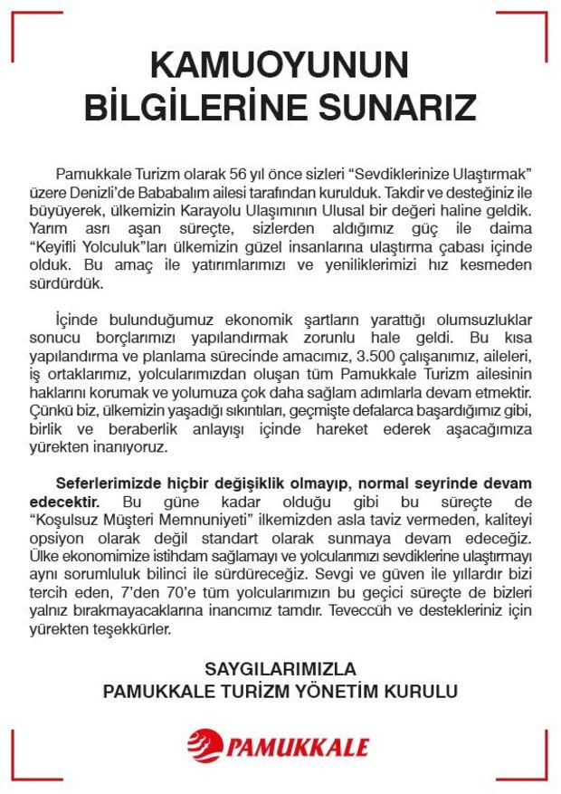 Konkordato haberlerine bir yenisi daha eklendi. Pamukkale Turizm konkordato talebinde bulundu. 1962 yılında, TBMM 1. dönem milletvekili Hacı Mazlum Bababalım'ın torunları tarafından kurulan şirket İzmir Ticaret Mahkemesi'ne başvurdu ve Pamukkale Turizm için üç aylık geçici mühlet verildi. Konkordato kapsamında şirkete bağlı iki iştirak de bulunuyor.Şirket faaliyetlerinin denetimi için de geçici konkordato komiser heyeti atanırken, Pamukkale Turizm resmi sitesinden bir açıklamada bulundu. 600 otobüsü olan şirketin Ekonomik şartların zorluğuna ve seferlerin normal seyrinde süreceğine vurgu yaptığı açıklamada şu ifadeler kullanıldı: "İçinde bulunduğumuz ekonomik şartların yarattığı olumsuzluklar sonucu borçlarımızı yapılandırmak zorunlu hale geldi. Bu kısa yapılandırma ve planlama sürecinde amacımız 3500 çalışanımız, aileleri, iş ortaklarımız ve yolcularımızdan oluşan tüm Pamukkale Turizm ailesinin haklarını korumak ve yolumuza çok daha sağlam adımlarla devam etmektir. Seferlerimizde hiçbir değişiklik olmayıp normal seyrinde devam edecektir."Pamukkale Turizm yetkilileri 15 milyona yakın yolcusu bulunan şirketin nakit akışında problem yaşadığı ve borçların sorunsuz bir şekilde ödenebilmesi için vadeli konkordato ilan edildiğini belirtti.