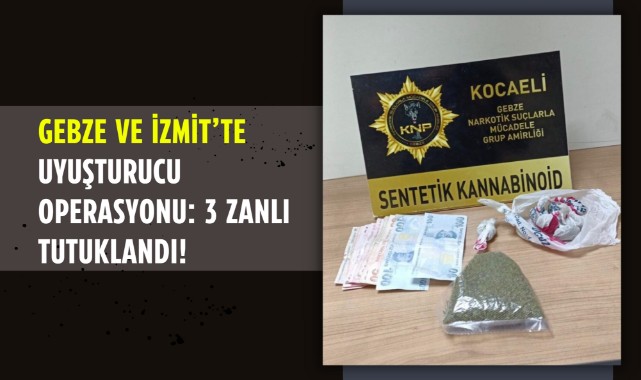 İl Emniyet Müdürlüğünden yapılan açıklamaya göre, Narkotik Suçlarla Mücadele Şubesi ekipleri, İzmit ve Gebze'de uyuşturucu ve uyarıcı madde imalatı, ticareti ve kullanımıyla mücadele kapsamında operasyonlar düzenledi. Operasyonlarda 8 şüpheli gözaltına alındı. Şüphelilerin ikamet ve üst aramalarında 87 gram bonzai, 71 adet uyuşturucu hap, 1 gram metamfetamin ile uyuşturucu ticaretinden elde edildiği değerlendirilen 425 lira ele geçirildi. Emniyetteki işlemlerinin ardından 5 şüpheli serbest bırakıldı. Adliyeye sevk edilen F.D, H.Ö, ile E.E. çıkarıldıkları nöbetçi hakimlikçe tutuklandı.