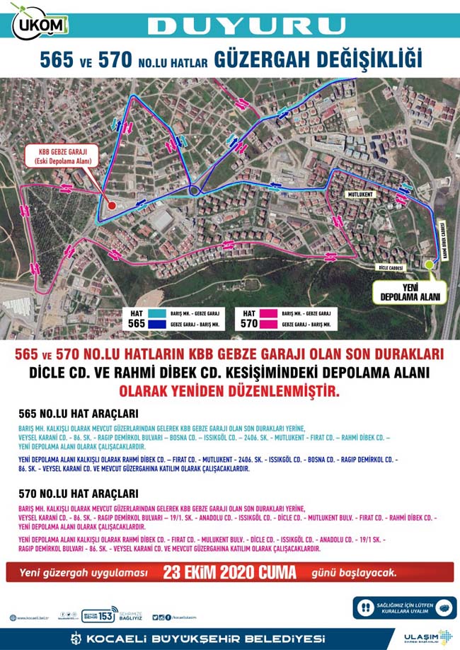 Yapılan yeni düzenlemeye göre 570 numaralı hat araçları; Barış Mahallesi kalkışlı olarak mevcut güzerlarından gelerek KBB Gebze garajı olan son durakları yerine Veysel Karani Caddesi, 86. Sokak, Ragıp Demirkol Bulvarı, 19/1. Sokak, Anadolu Caddesi, Issıkgöl Caddesi, Dicle Caddesi, Mutlu Kent Bulvarı, Fırat Caddesi, Rahmi Dibek Caddesi ve yeni depolama alanı olarak çalışacak. Yeni depolama alanı kalkışlı olarak Rahmi Dibek Caddesi, Fırat Caddesi, Mutlukent Bulvarı, Dicle Caddesi, Issıkgöl Caddesi, Anadolu Caddesi, 19/1 Sokak, Ragıp Demirkol Bulvarı, 86. Sokak, Veysel Karani Caddesi ve mevcut güzergahına katılım olarak çalışacak. Yeni güzergah uygulaması 23 Ekim 2020 Cuma gününden itibaren başlayacak.